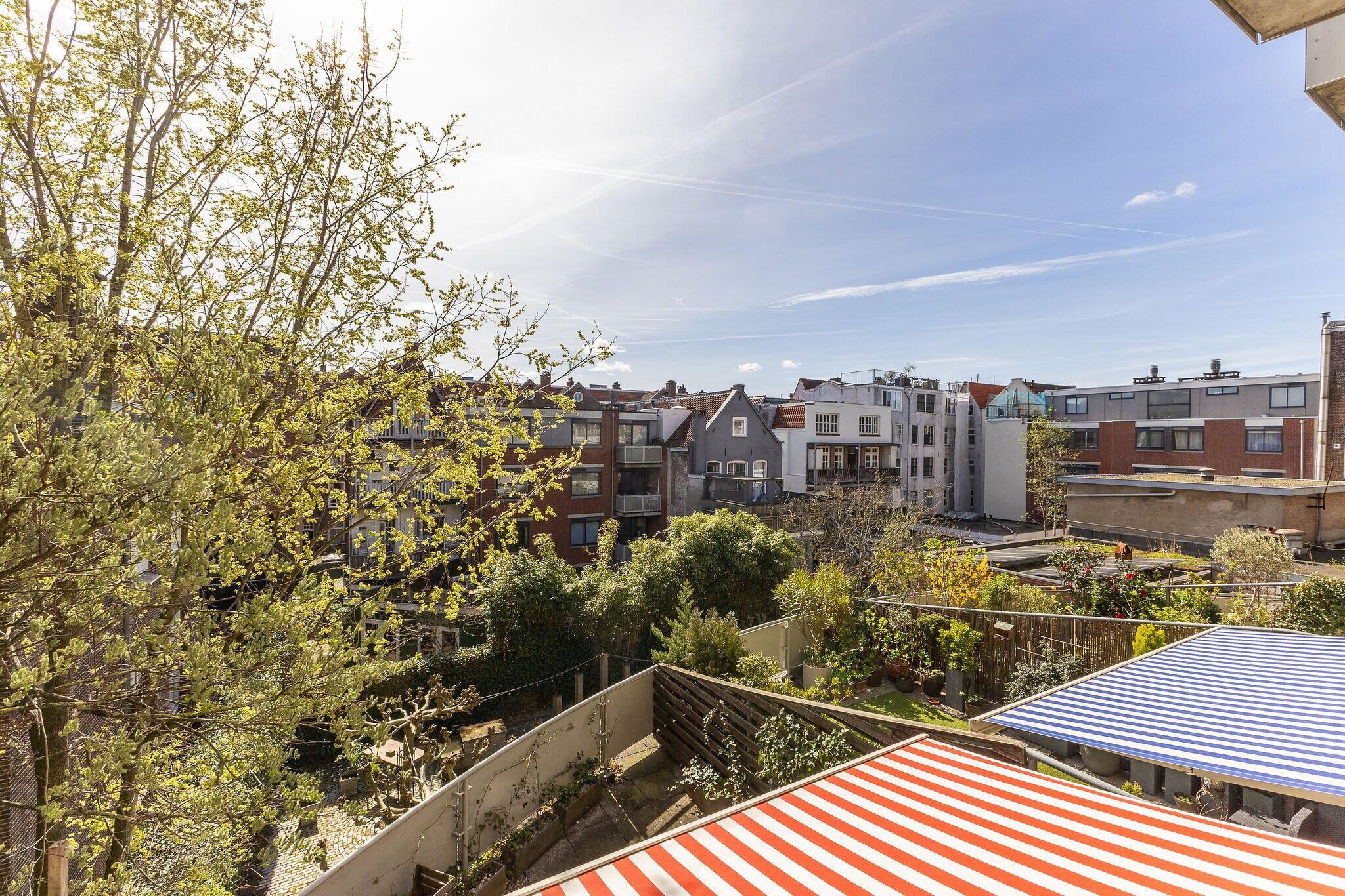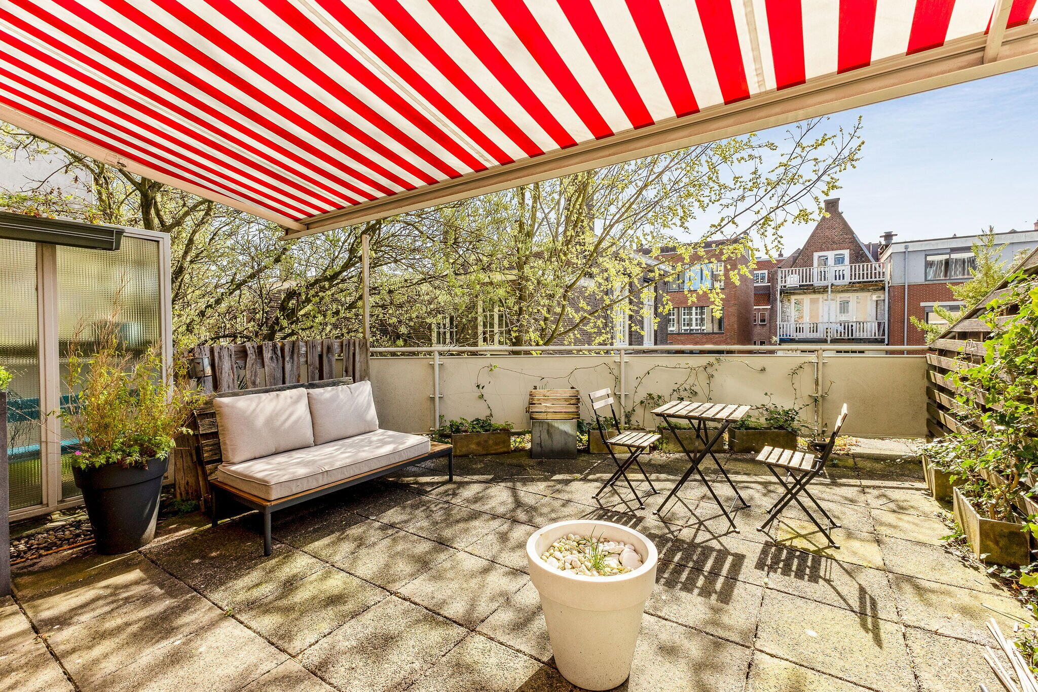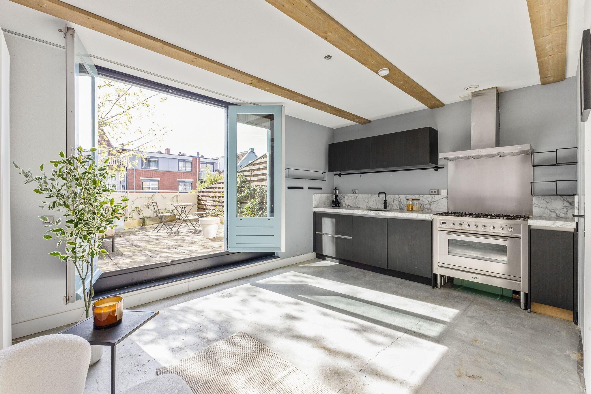 At the rear, you will find the modern kitchen (2018), equipped with various built-in appliances including an oven, six-burner gas stove, dishwasher, and a Quooker tap. From the kitchen, you have direct access to the generous roof terrace of approximately 26 m², which is fitted with wide electric sunshades.