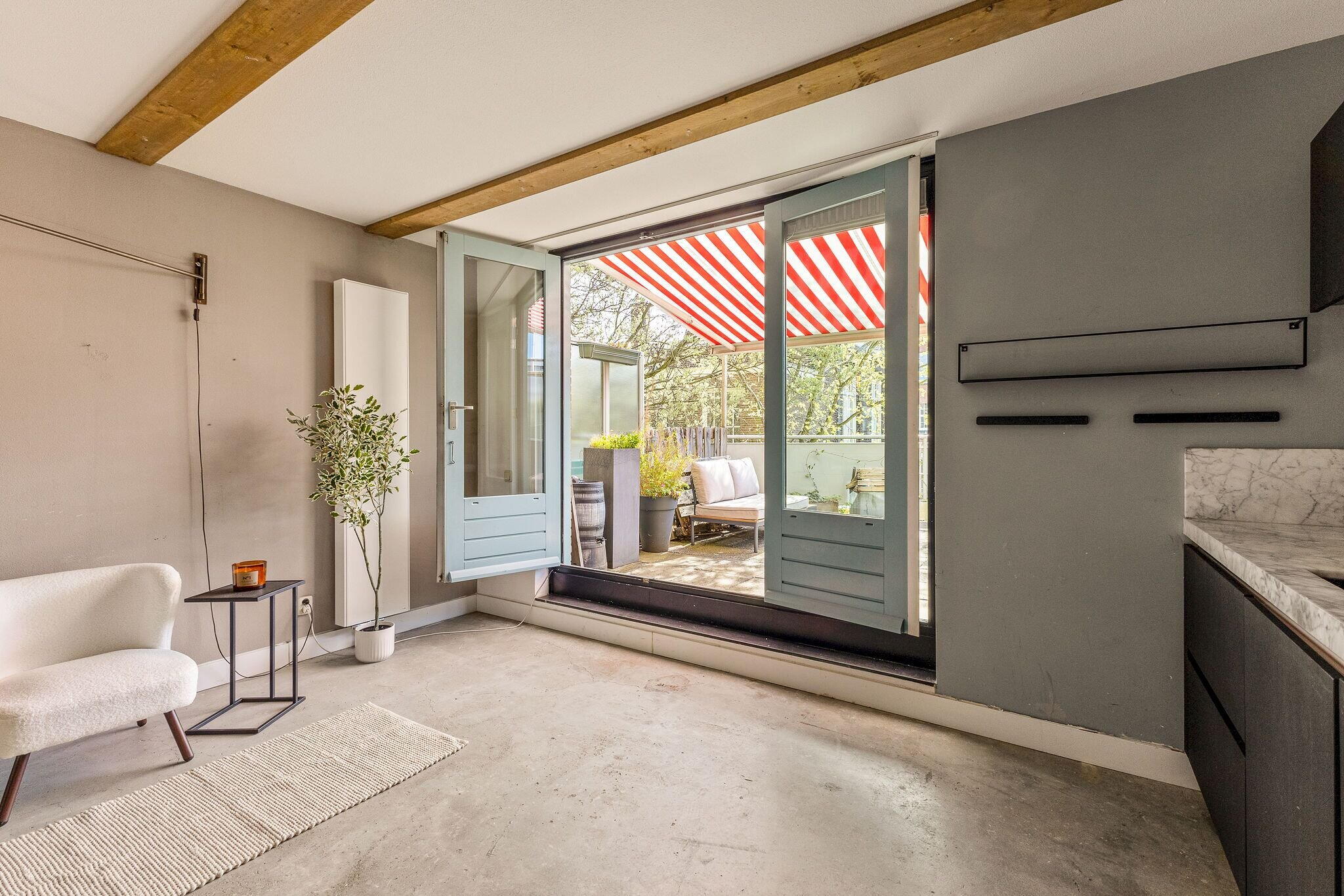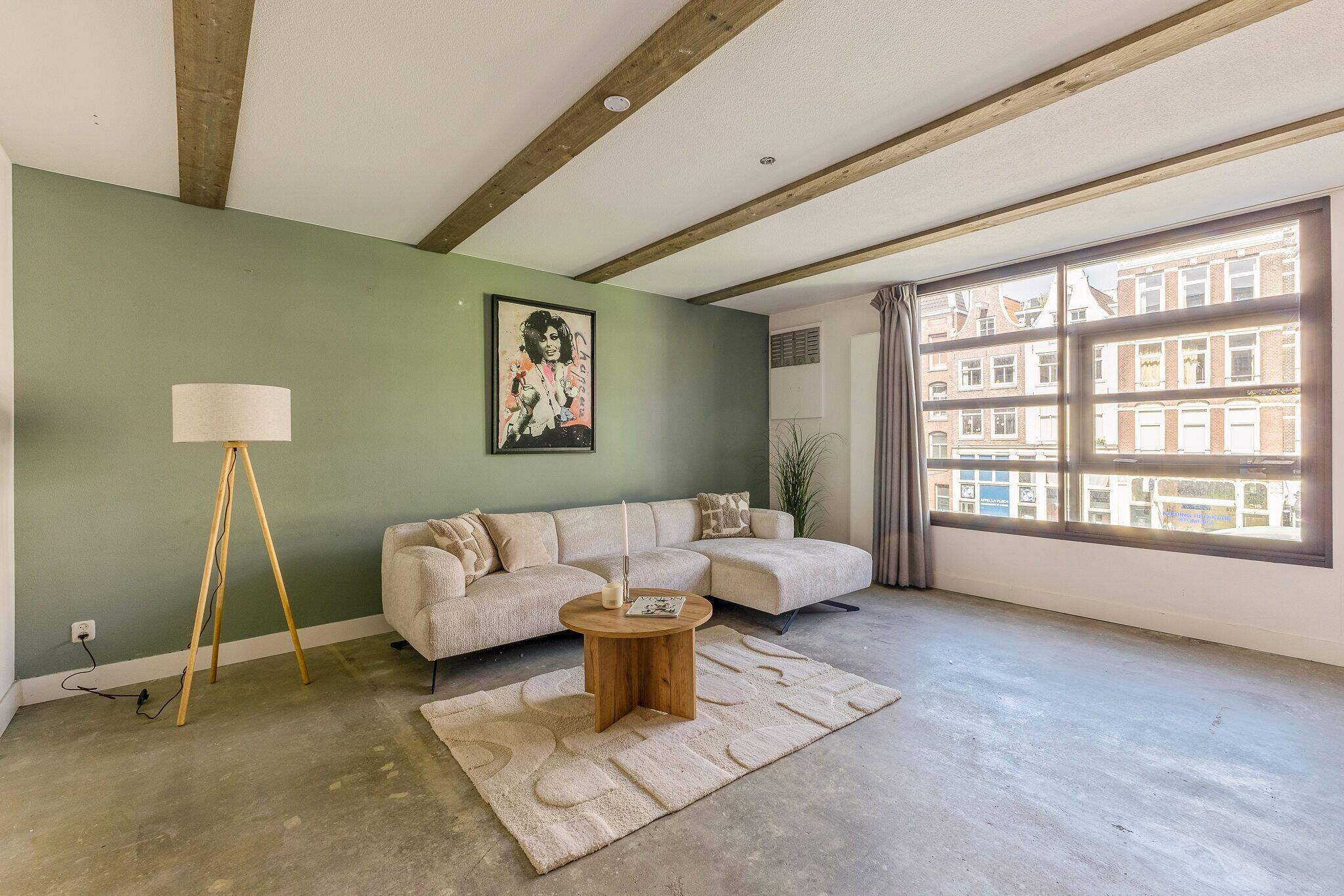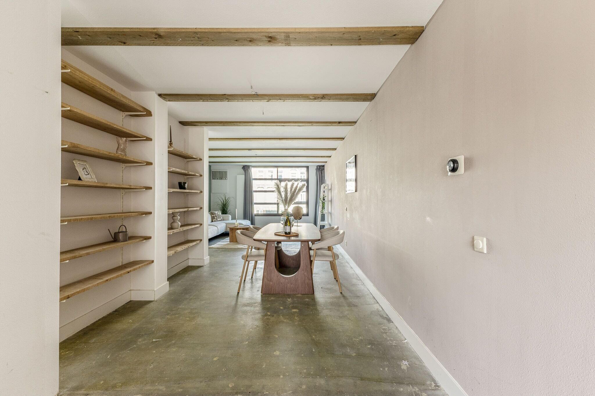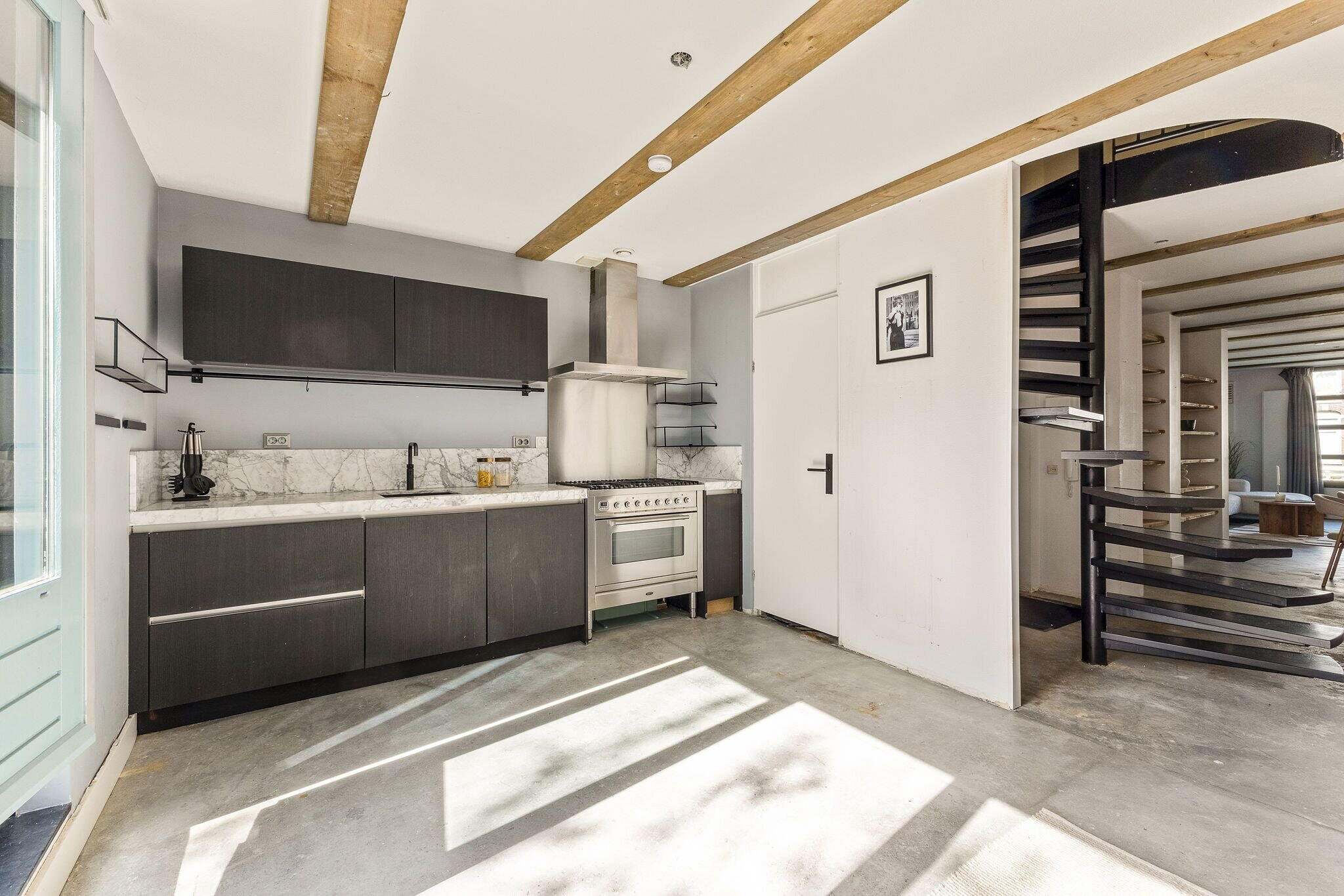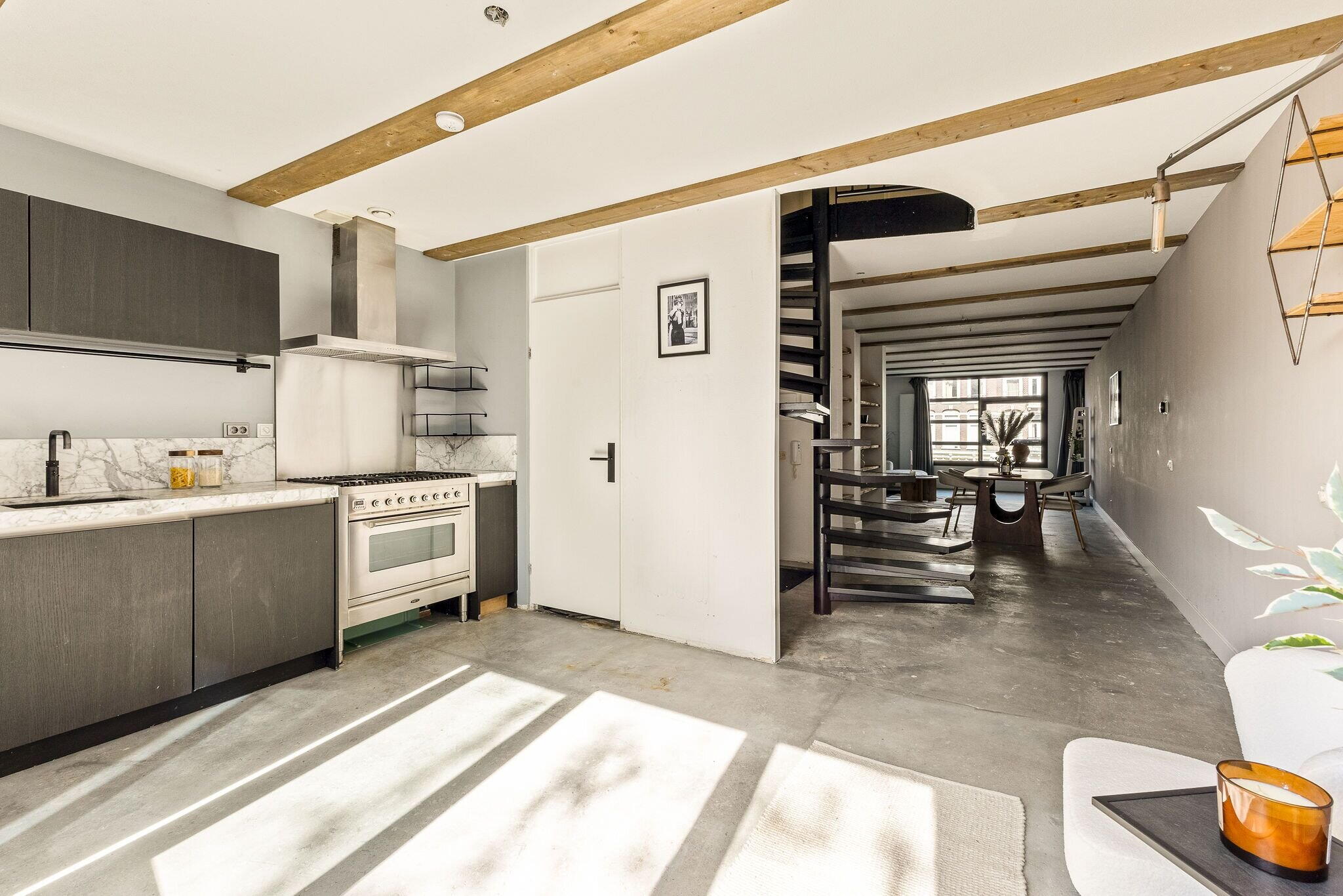 Aan de voorzijde bevindt zich de lichte woonkamer met uitzicht over de levendige Rozengracht. De huidige betonvloer geeft de ruimte een moderne en industriële uitstraling en vormt een mooie basis om de woning verder naar eigen smaak af te werken.