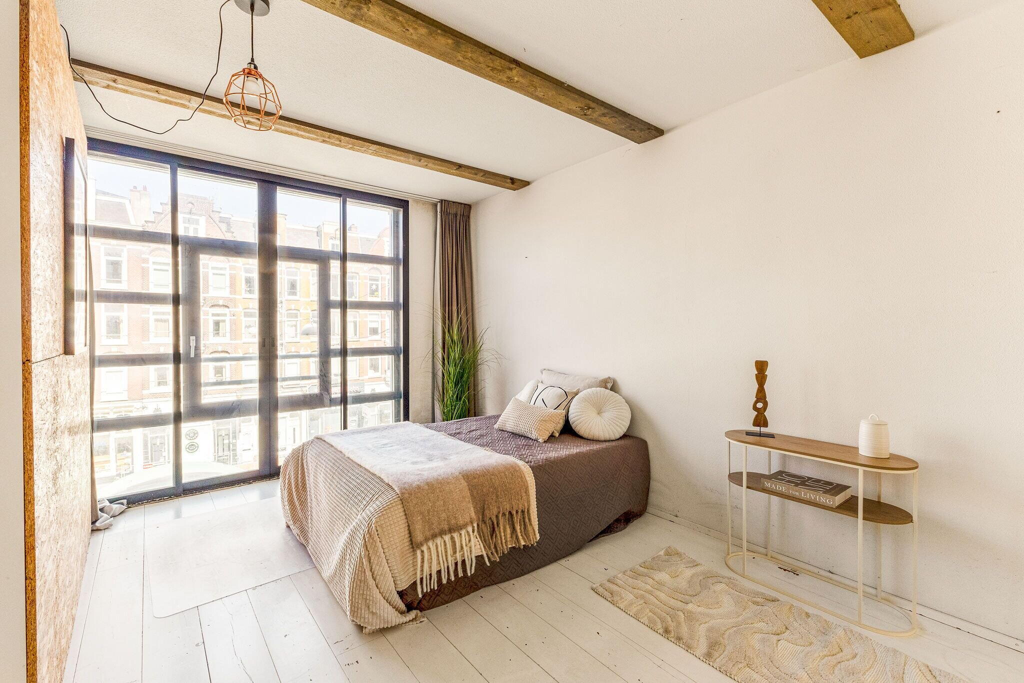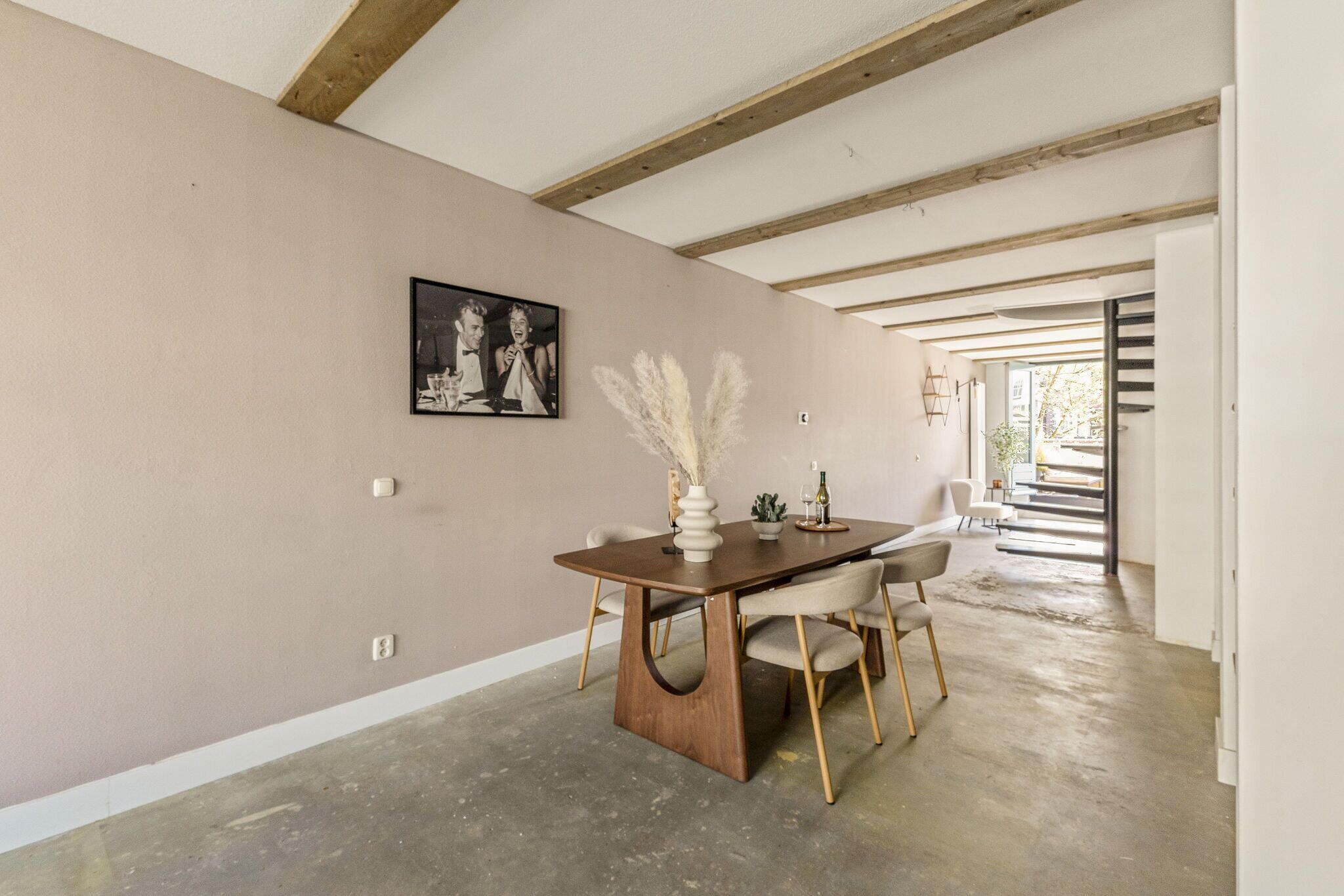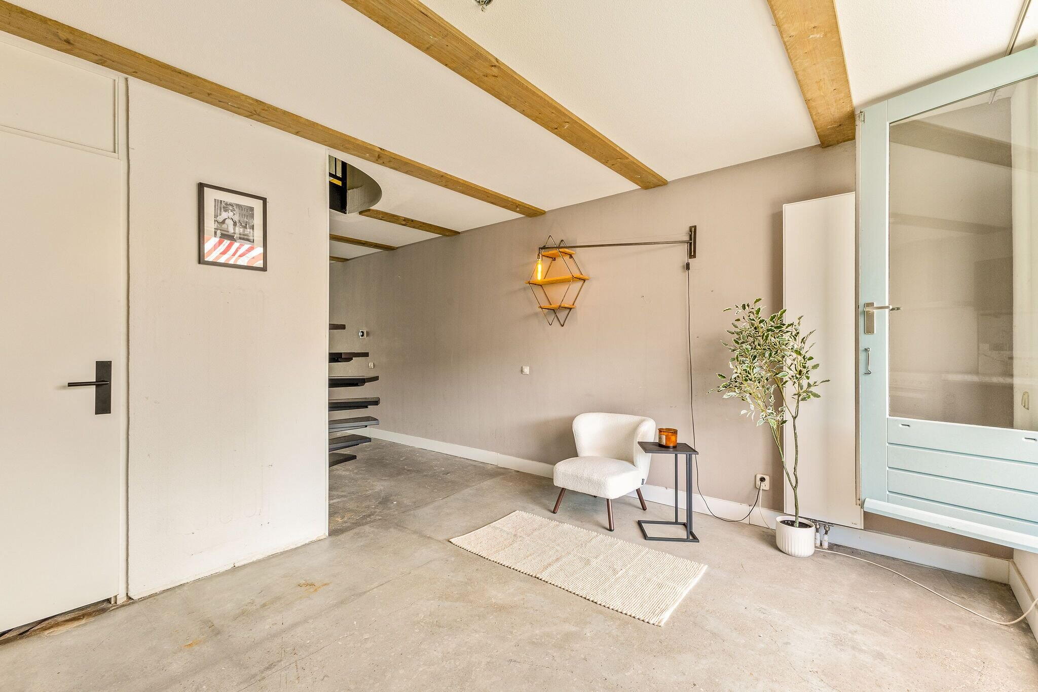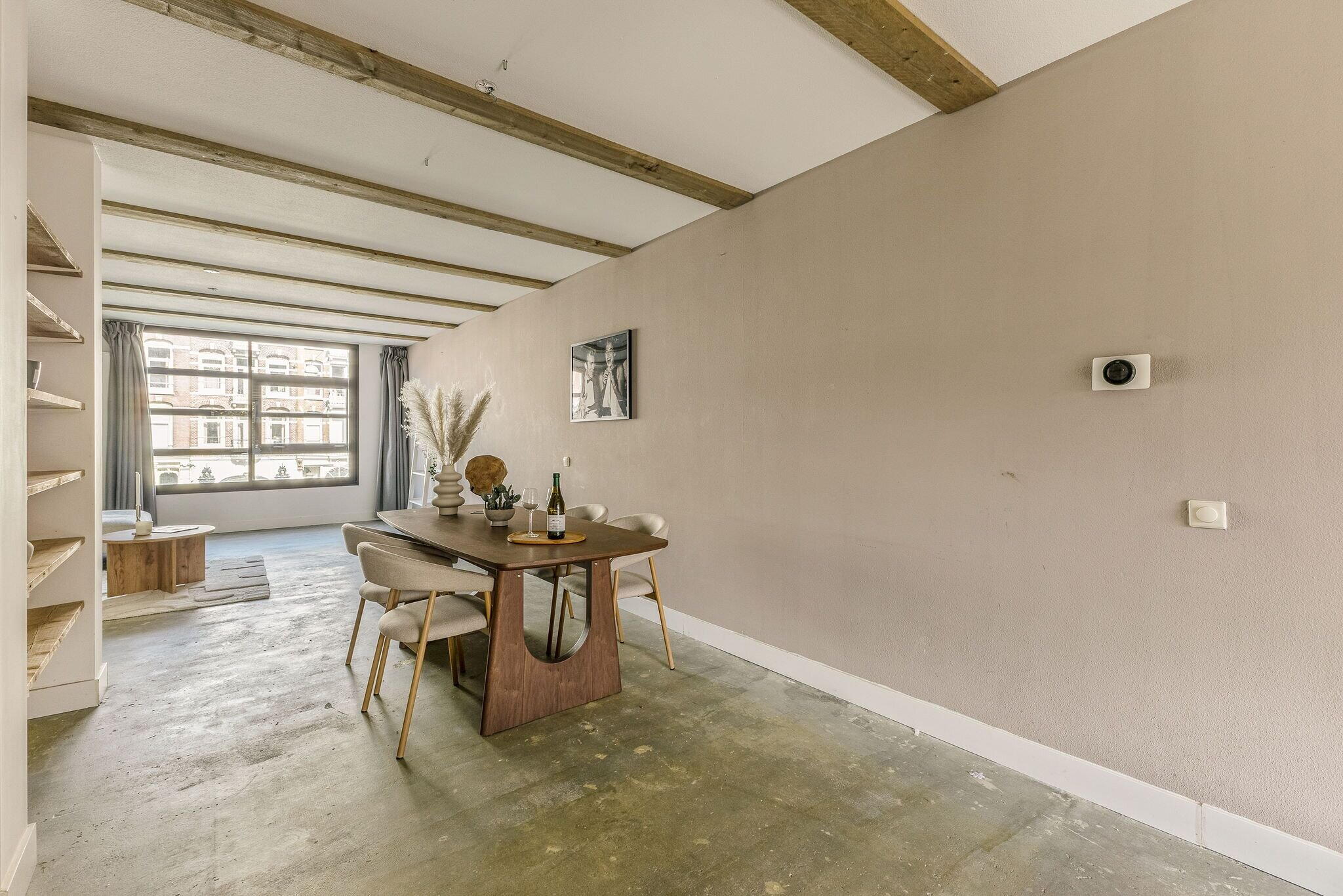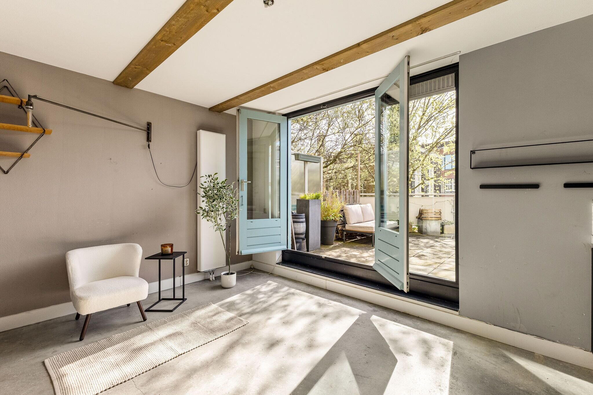 Aan de voorzijde bevindt zich de lichte woonkamer met uitzicht over de levendige Rozengracht. De huidige betonvloer geeft de ruimte een moderne en industriële uitstraling en vormt een mooie basis om de woning verder naar eigen smaak af te werken.