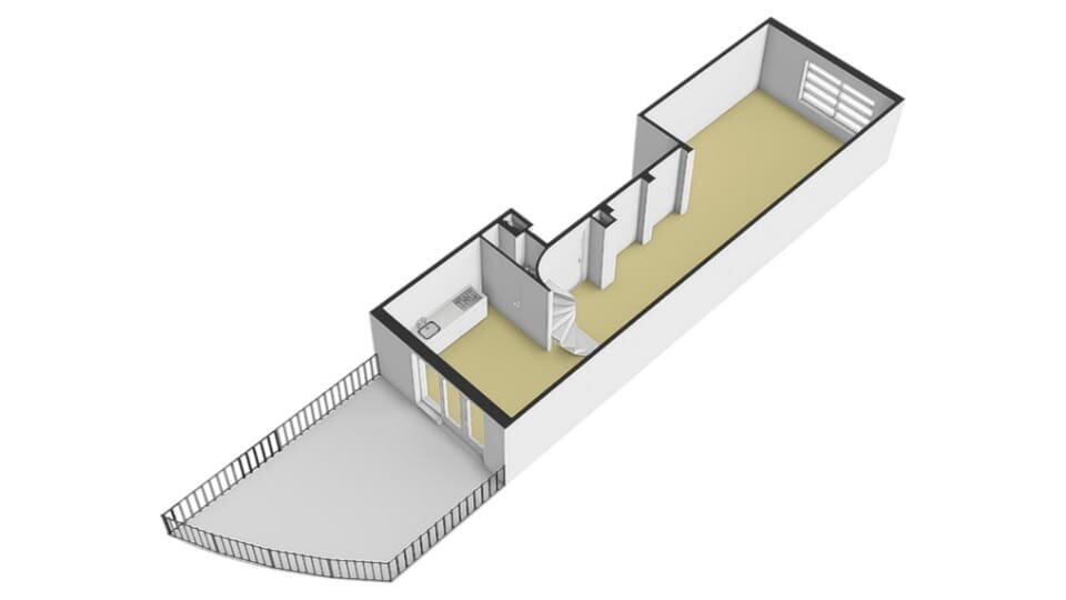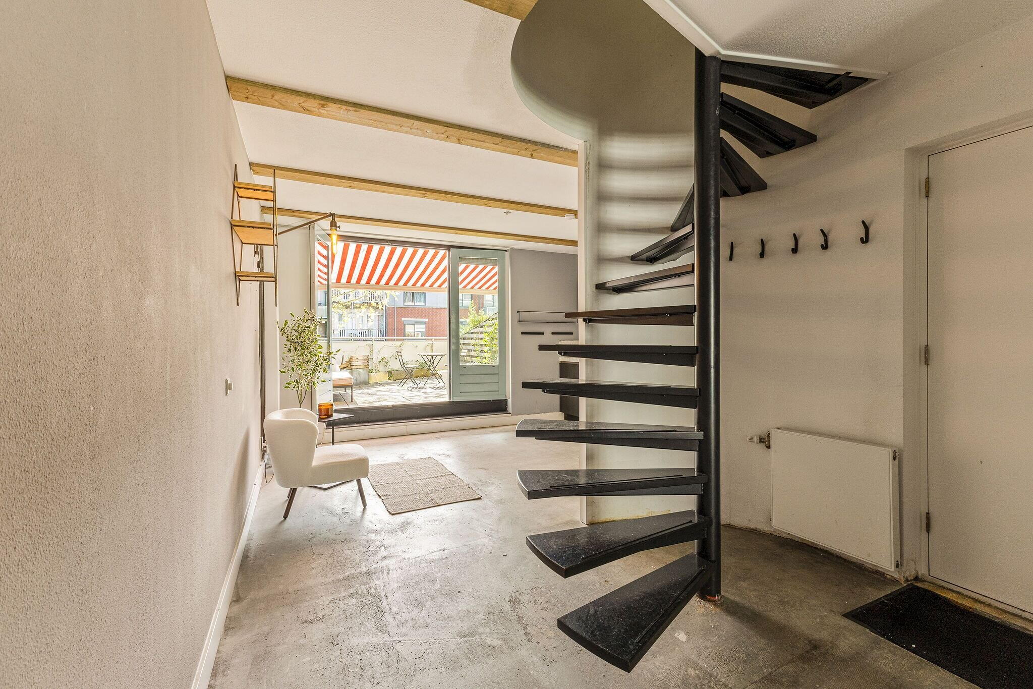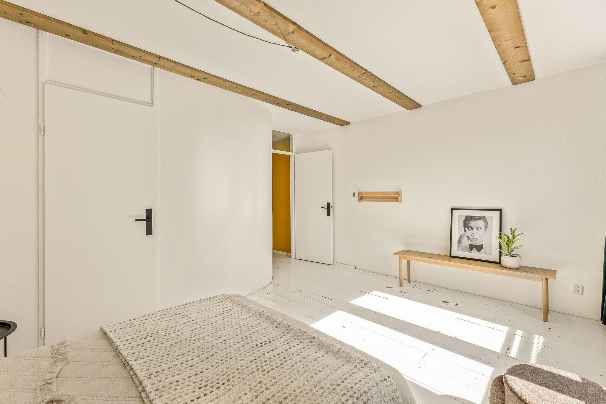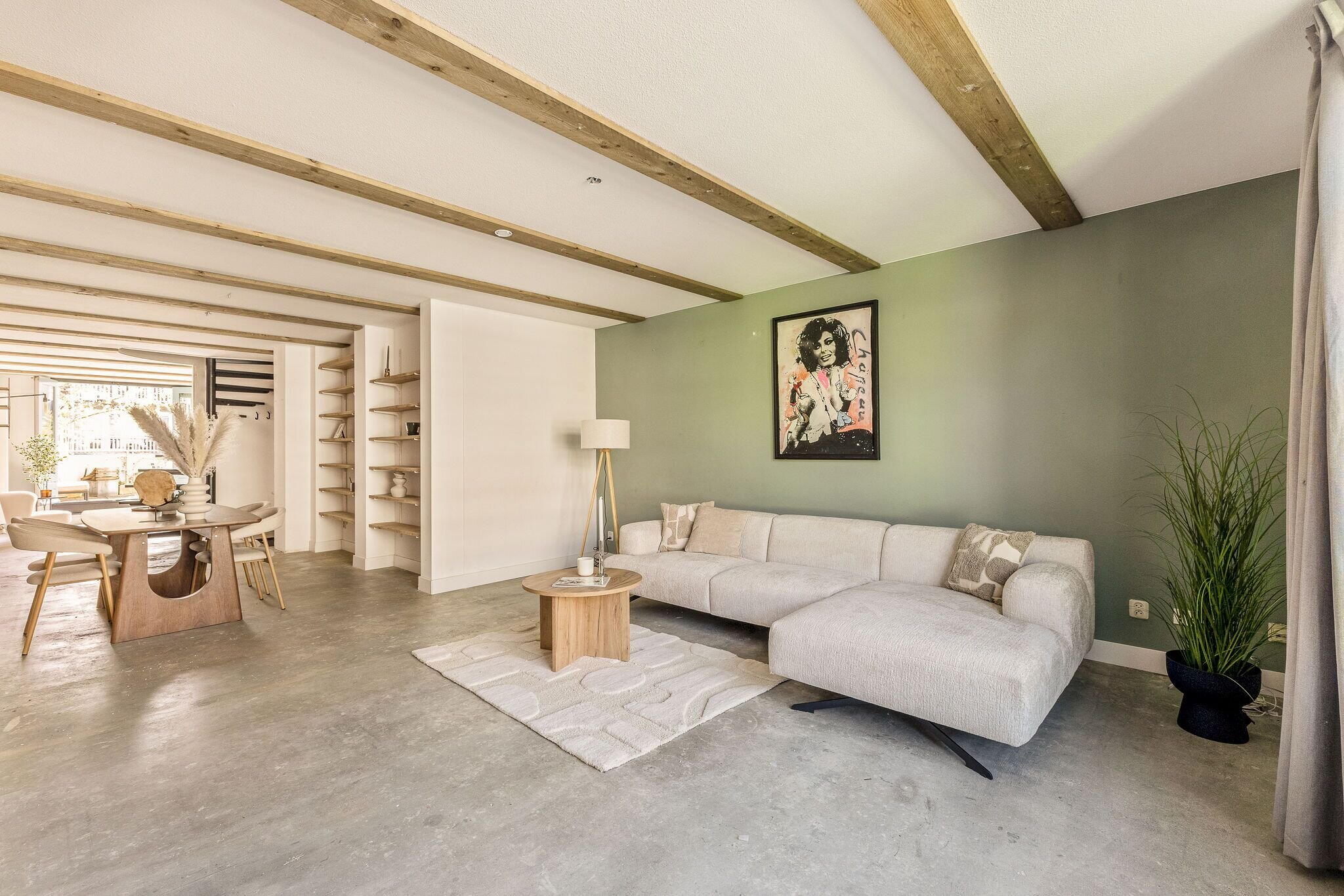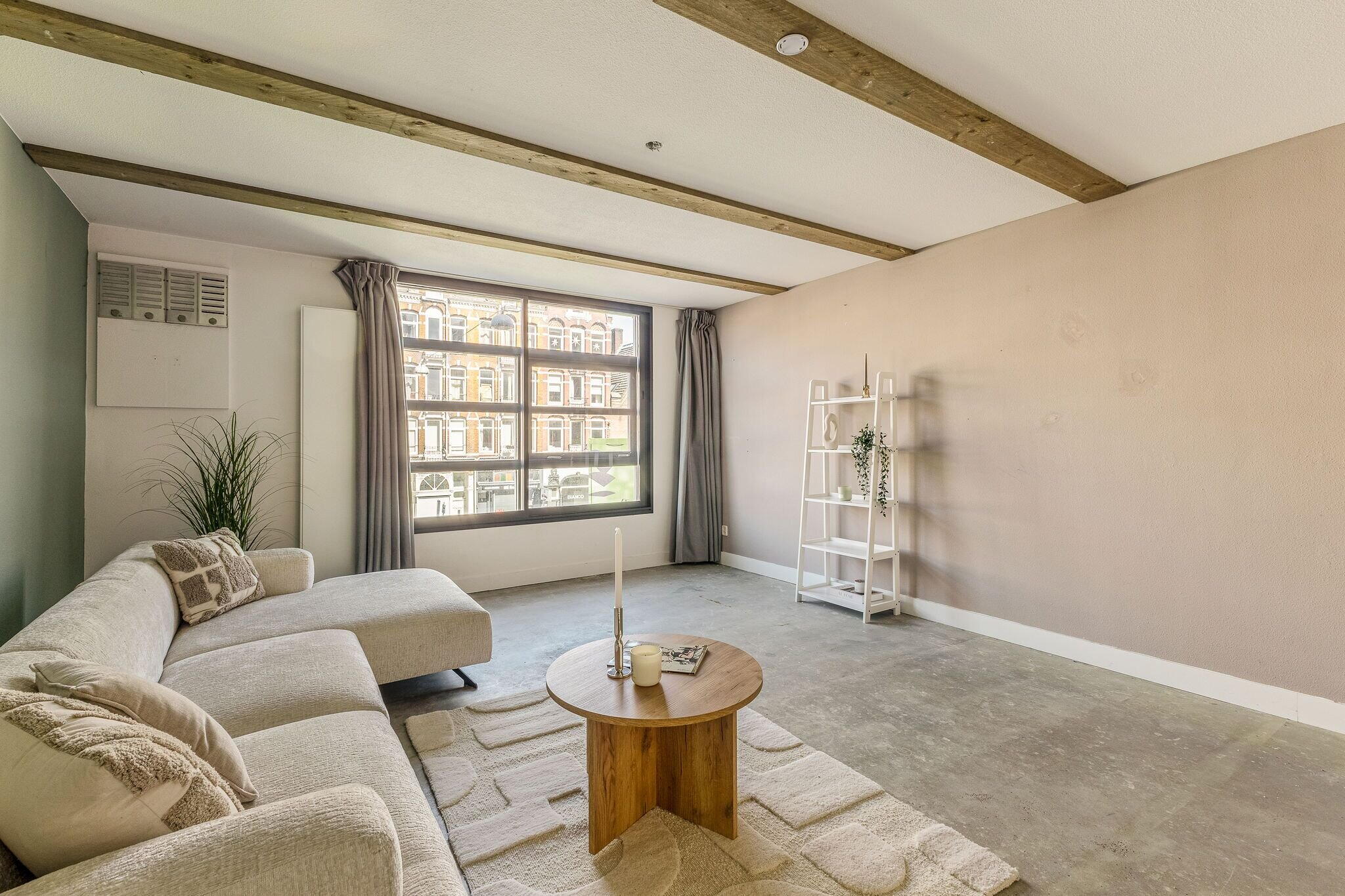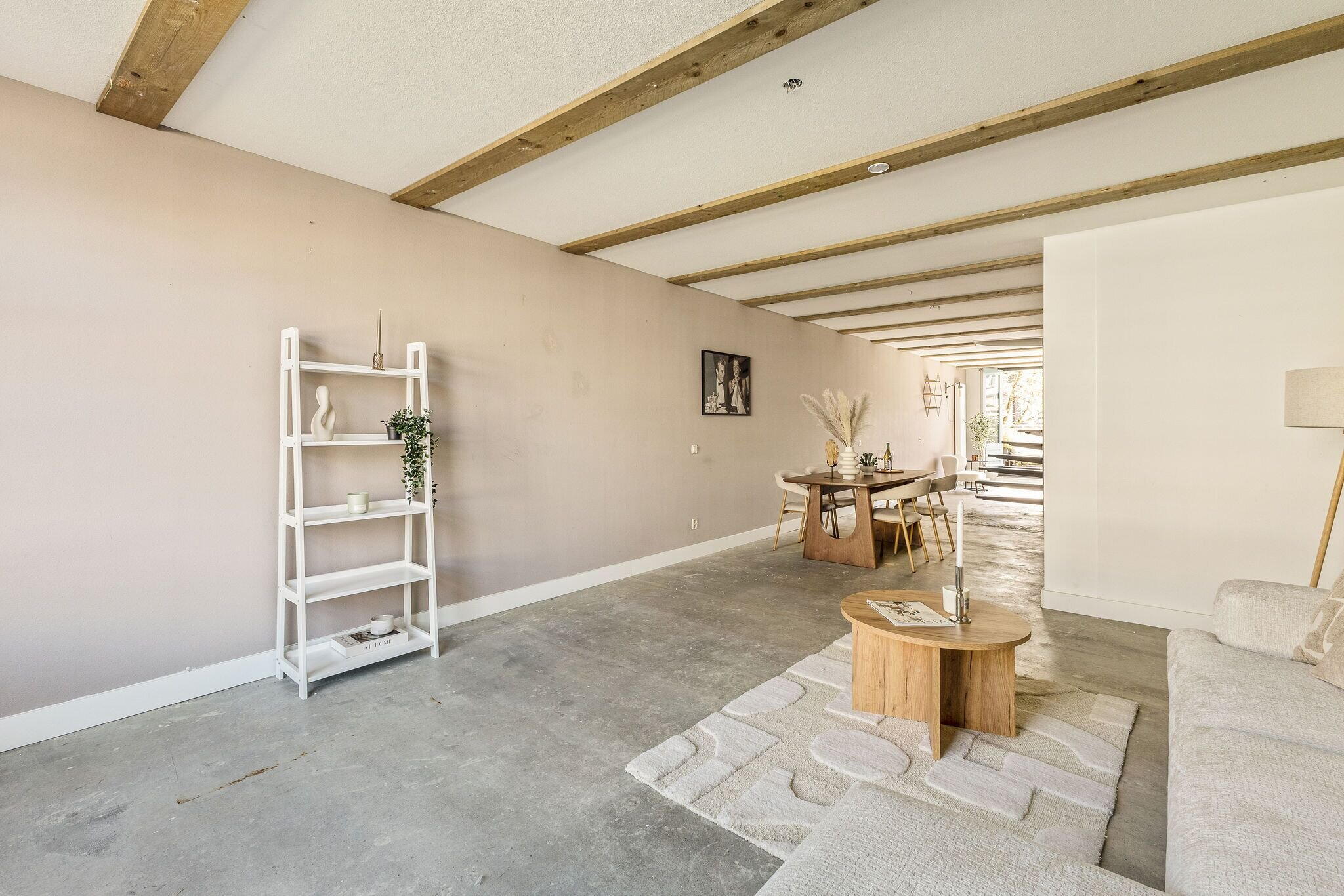 Aan de voorzijde bevindt zich de lichte woonkamer met uitzicht over de levendige Rozengracht. De huidige betonvloer geeft de ruimte een moderne en industriële uitstraling en vormt een mooie basis om de woning verder naar eigen smaak af te werken.
