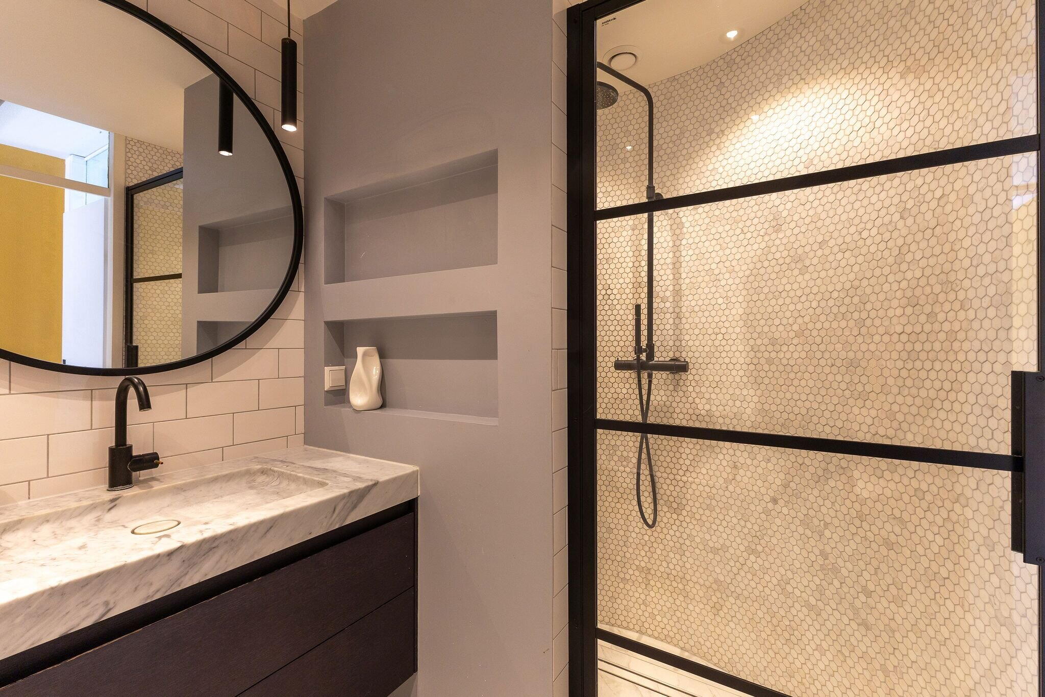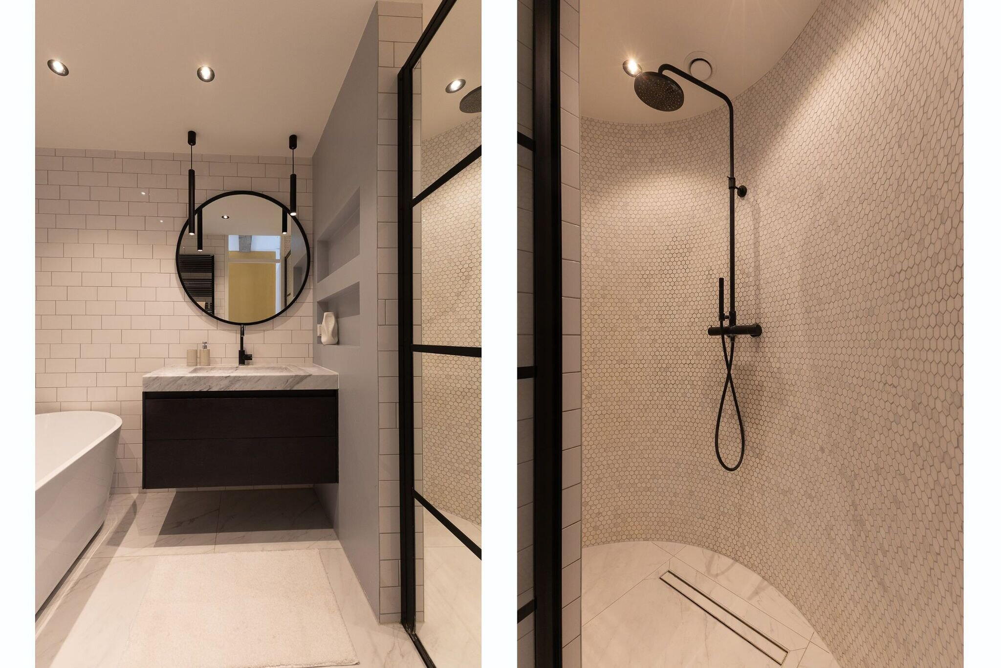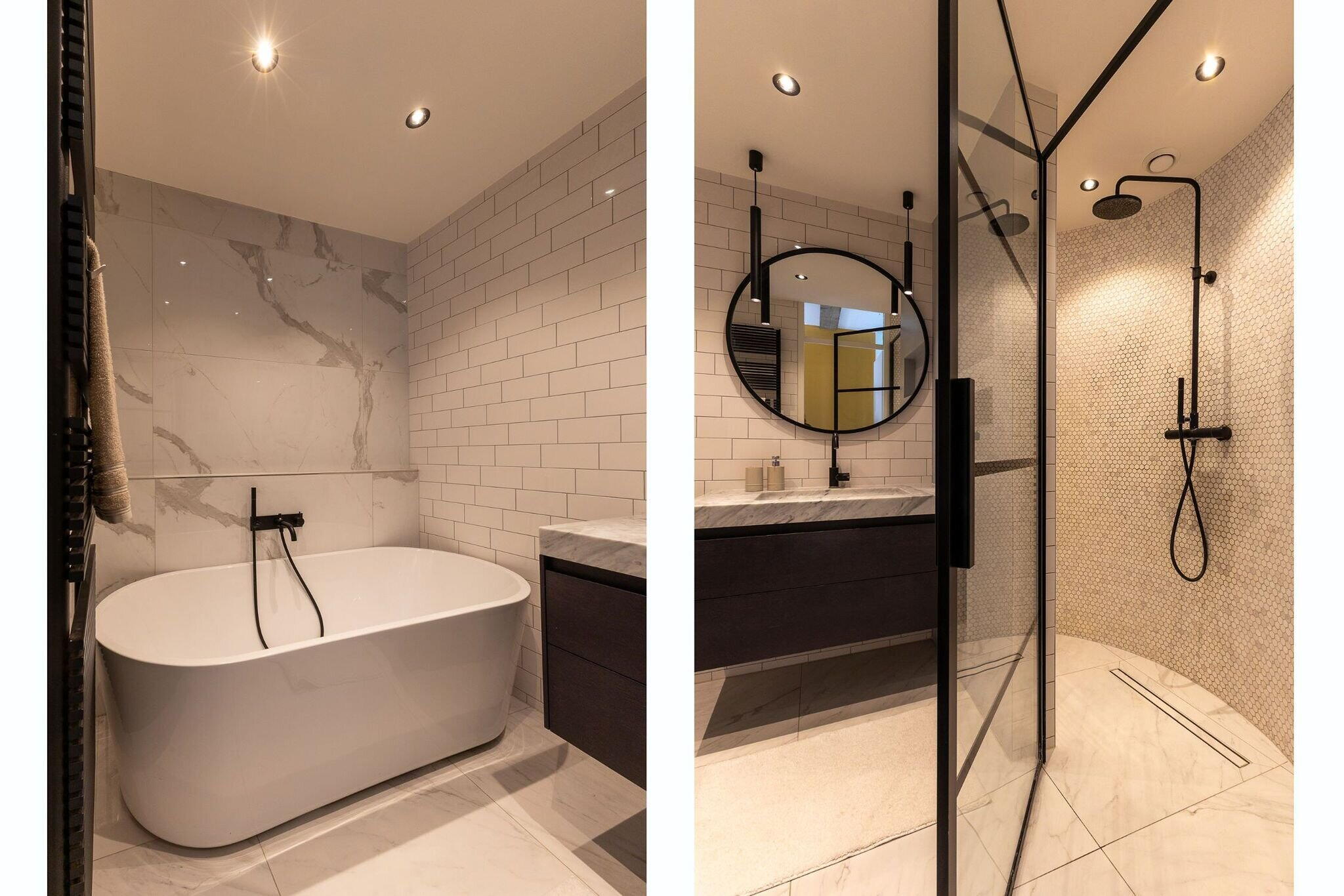 In the center is the luxurious bathroom (2019), featuring a spacious walk-in shower and a bathtub. At the rear is a large bedroom with French doors and a Juliet balcony. At the front is the second generously sized bedroom with a freestanding wardrobe wall and views over the Rozengracht.